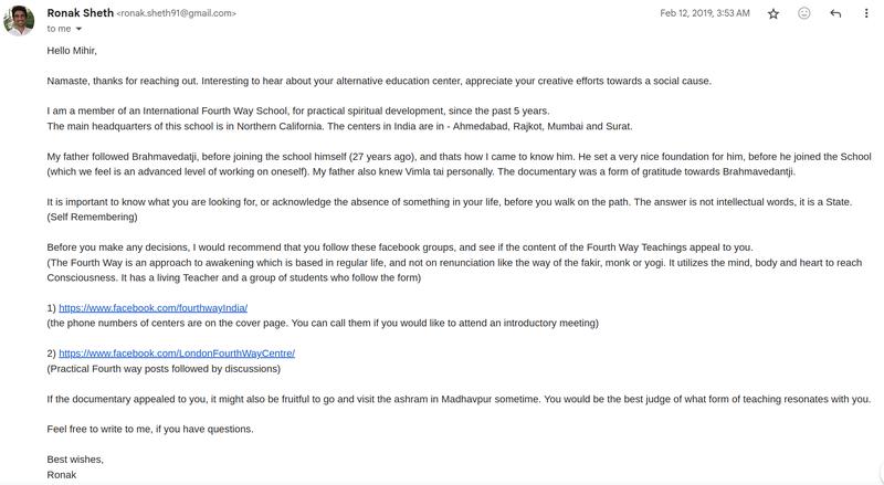 Then I accidentally found a documentary on Swami Brahmvedantaji on YouTube, where he explained about G’s work. I somehow got the contact details of the person who made the documentary - Ronak Seth (son of Darshan Seth who was a follower at the same place). I emailed him… I am talking about 2019.